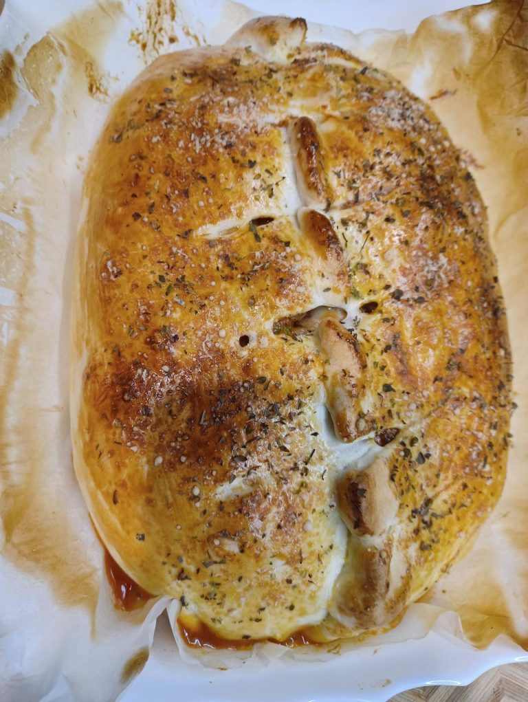 STEVIG GEVULDE CALZONE MET GROENTE, KIPPENDIJ EN GEHAKT.