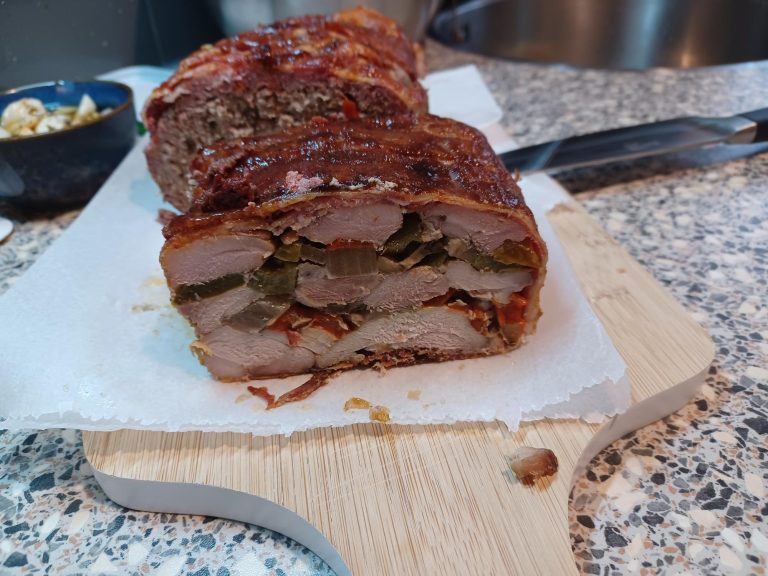 GEHAKTBROOD MET KIPPENDIJ, GROENTE EN BACON.