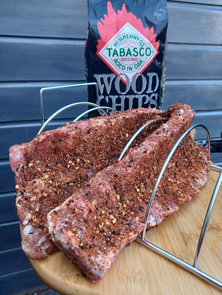 SPARERIBS VIKING GEKRUID EN GEROOKT OP TABASCO WOOD CHIPS.