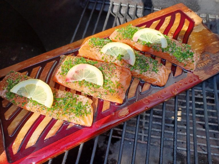 NOORSE ZALM OP EEN ROOKPLANK MET RODE WIJN EN LICHT GEKRUID.